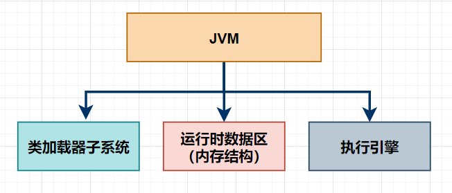 JVM主要由三个子系统构成,分别为:类加载器子系统、运行时数据区(内存结构)和字节码执行引擎。