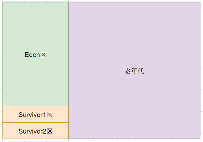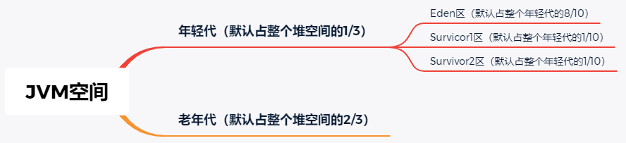 在JVM内部,会将整个堆空间划分成年轻代和老年代,年轻代默认会占整个堆内存空间的1/3,老年代默认会占整个堆内存空间的2/3。年轻代又会划分为Eden区和两个Survivor区,它们之间的默认比例是Eden:Survivor1:Survivor2 = 8:1:1。