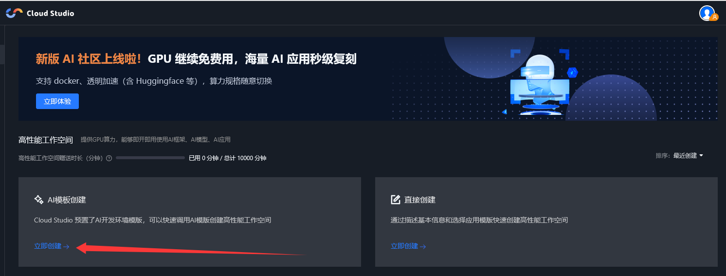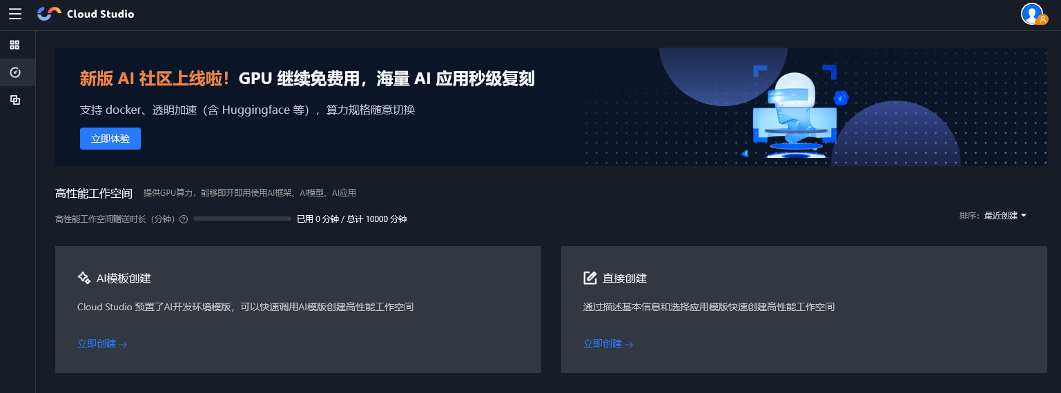 这次我们使用Cloud Studio进行部署,链接为:https://ide.cloud.tencent.com/dashboard/gpu-workspace (opens new window)