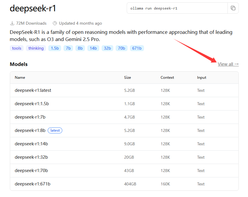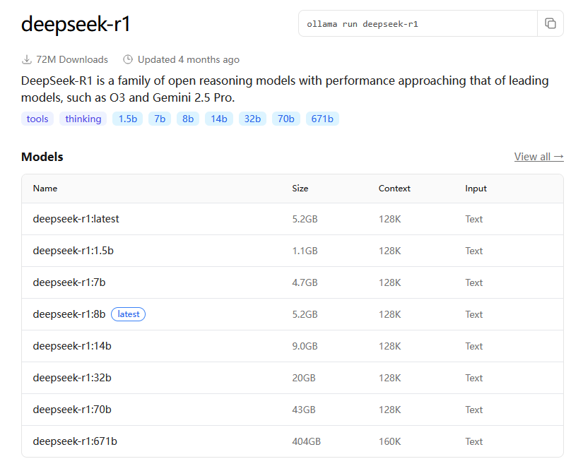 大家可以在Ollama支持的调用模型主页查看目前支持的模型情况,链接为:https://ollama.com/library/deepseek-r1 (opens new window)