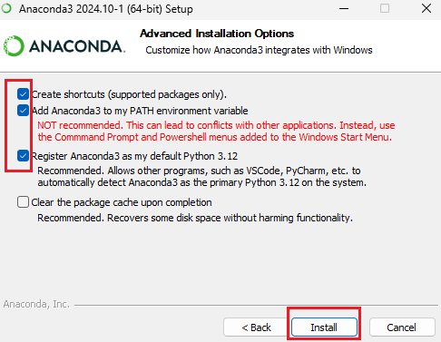 (2)Anaconda安装的下面步骤一定要勾选第二个选项,使其加入环境变量里,不然后期追加会比较麻烦。