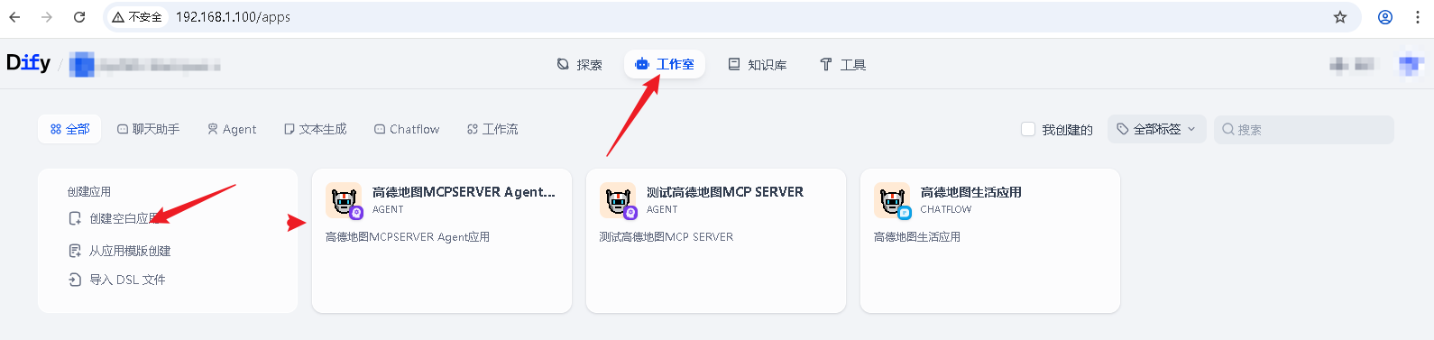 首先在Dify中创建新的应用。选择"工作流"类型,这样我们可以通过可视化方式构建复杂的处理逻辑。