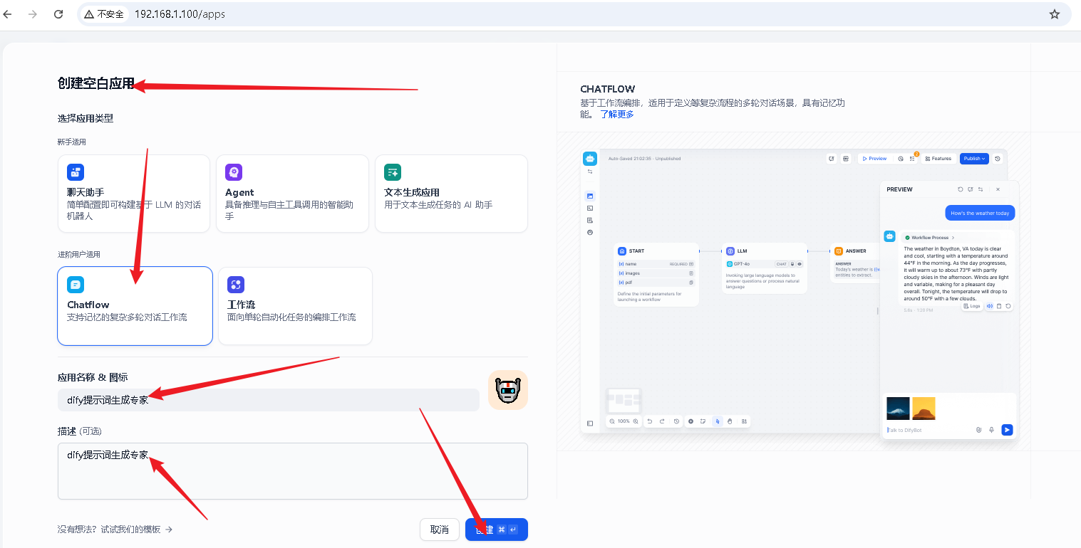 为应用命名,例如"dify提示词生成专家",并选择合适的图标和描述。
