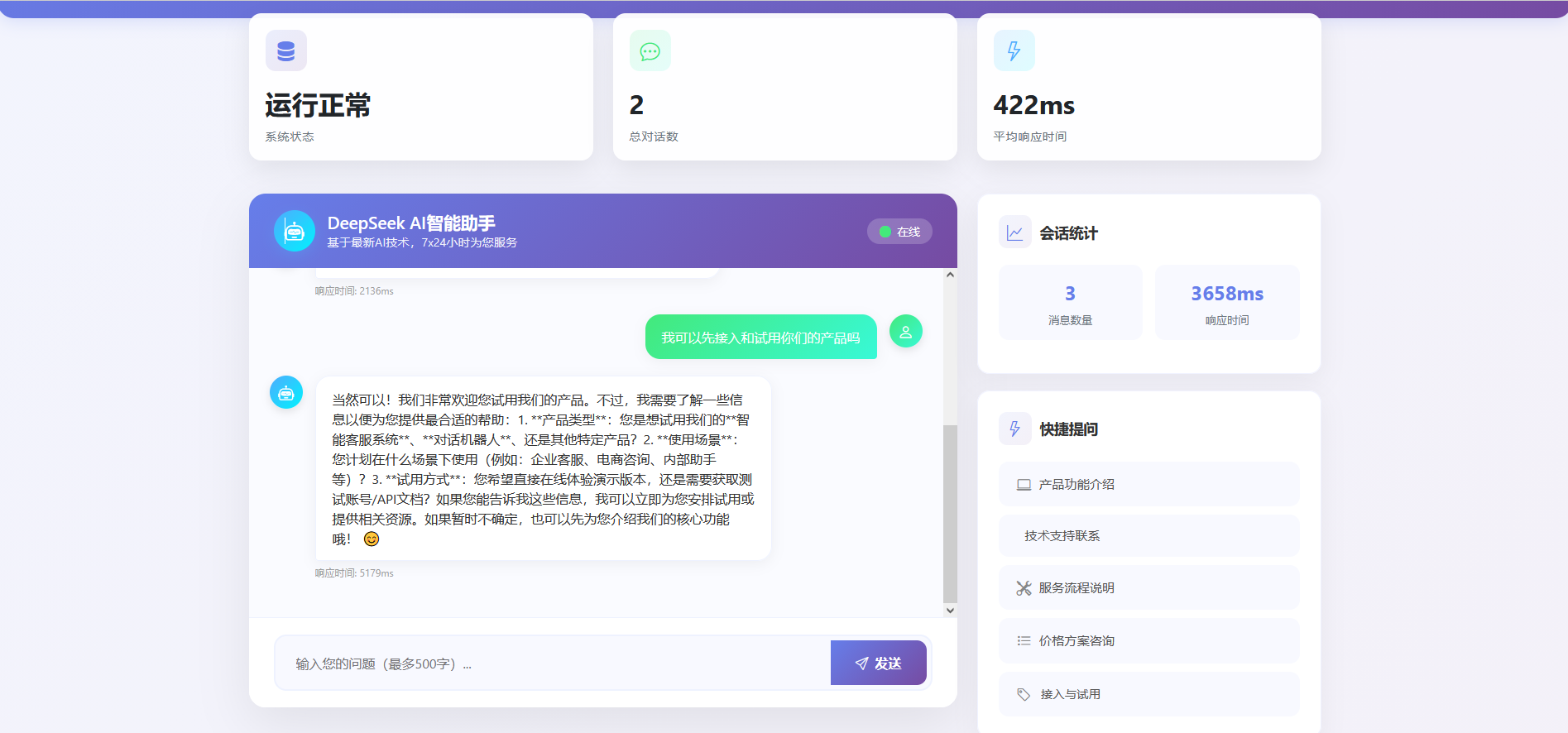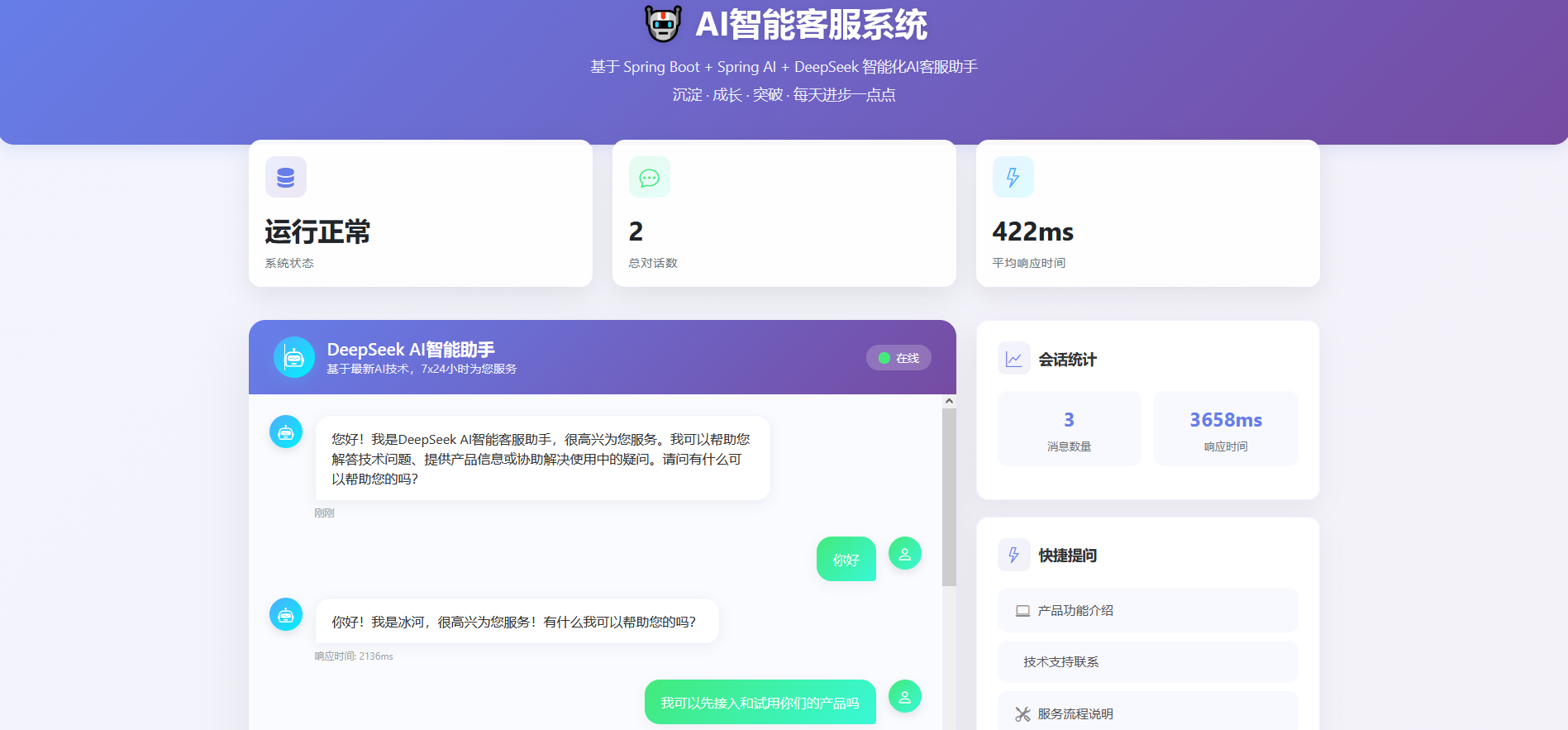AI智能客服系统整体功能包括:对话AI大模型、历史会话记录、实时监控与消息统计、系统健康检查、快捷提问等,整体页面效果: