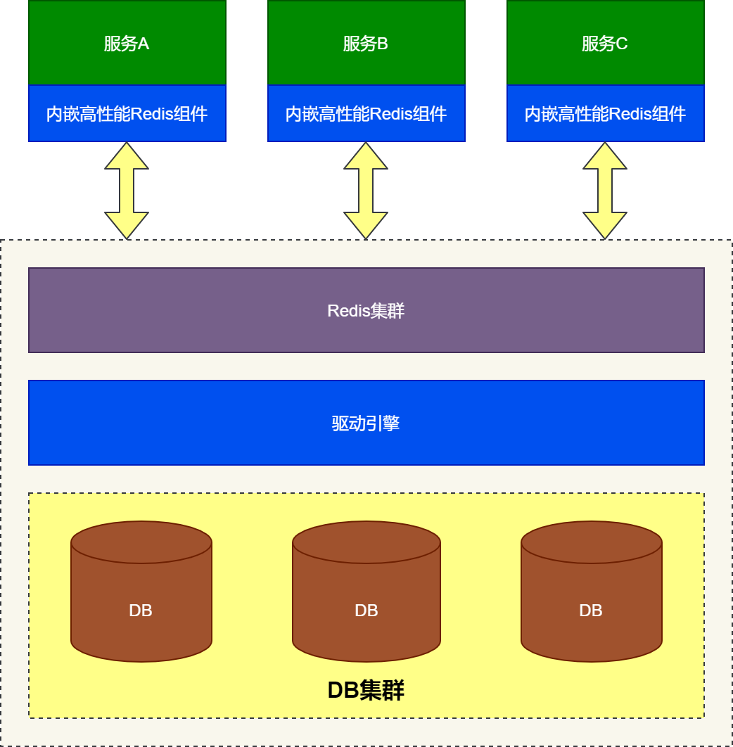 对于高性能Redis组件的落地方案来说,最简单的方式就是将组件构建成Jar包,并嵌入到服务内部使用,如下所示。