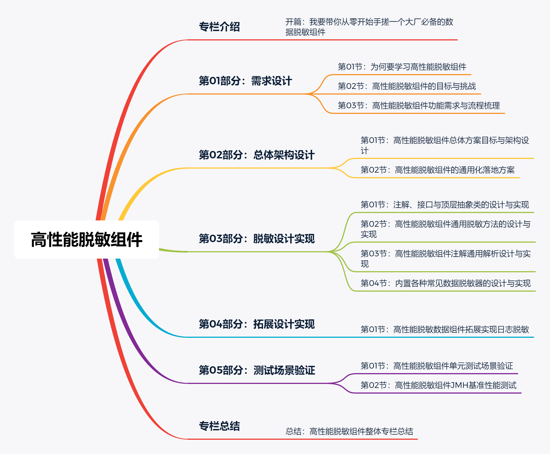 在整个《高性能脱敏组件 (opens new window)》项目和专栏中,我们从需求设计和总体架构设计开始,一路带着大家对高性能脱敏组件中最基础和最核心的内容进行设计和编码实现。整体专栏内容如下所示。